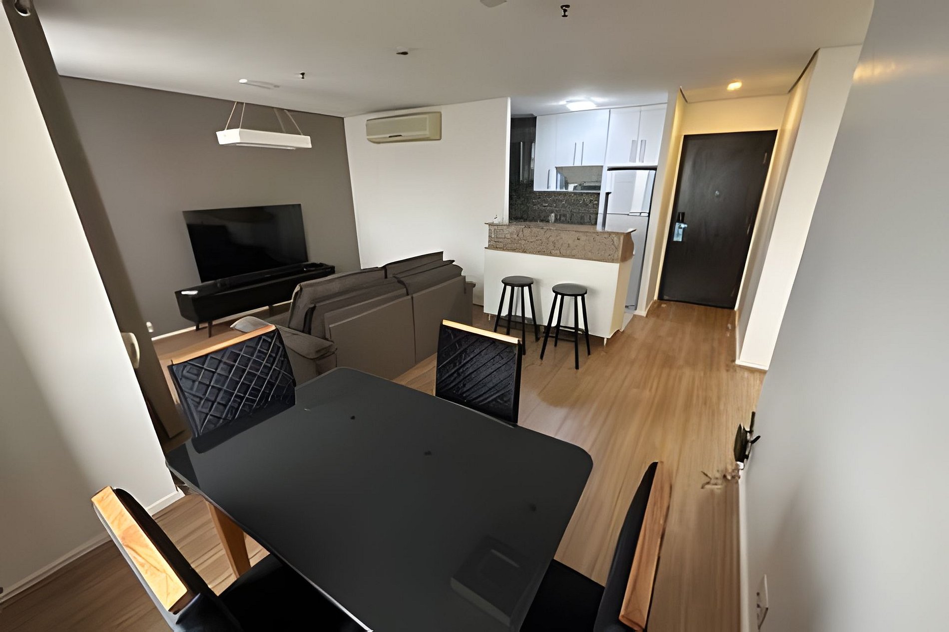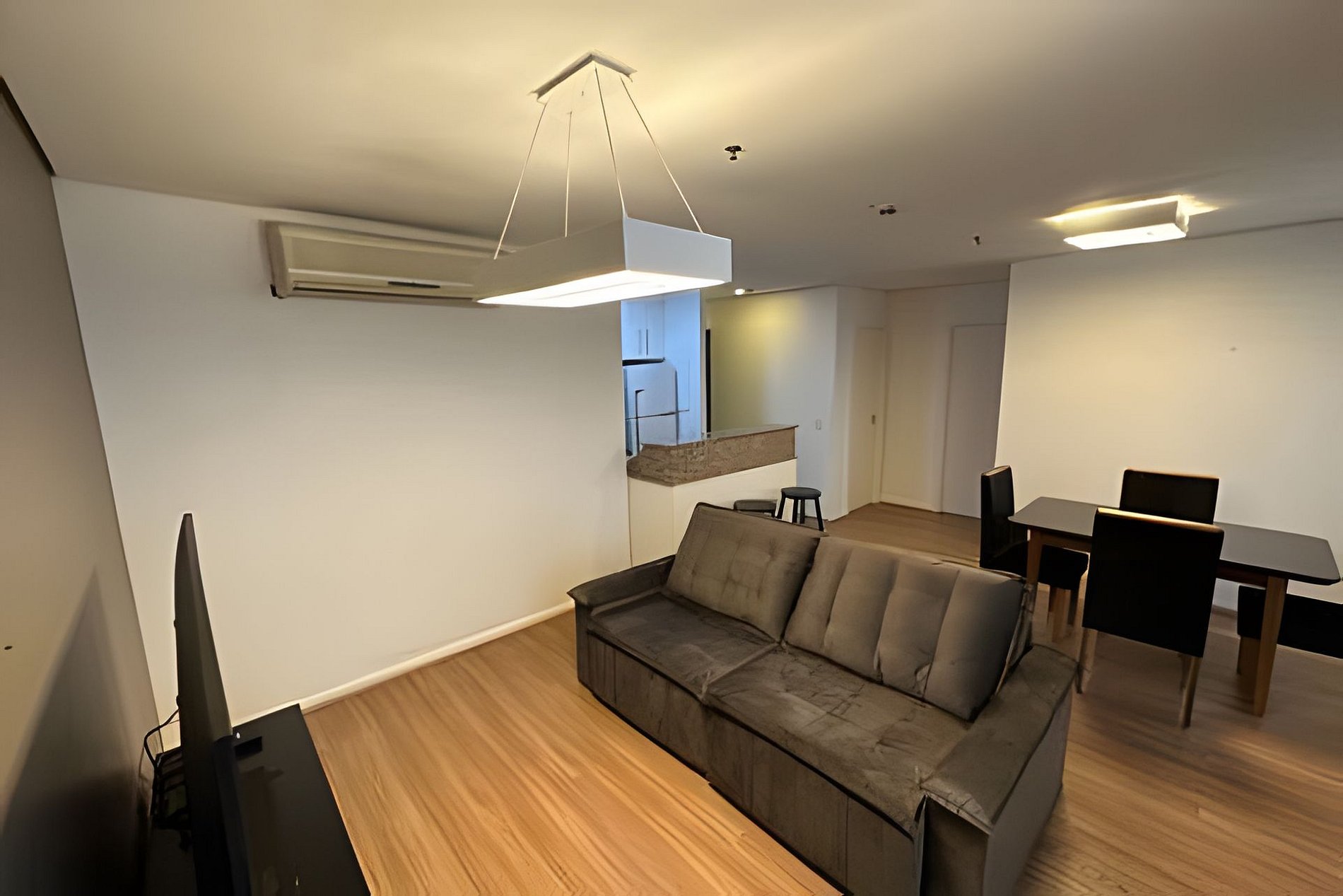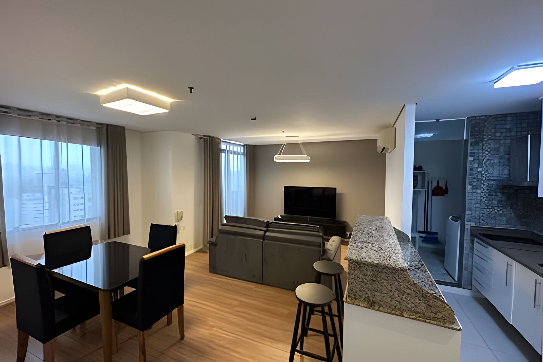 Situado em um complexo com cinema, praça de alimentação e próximo a vários restaurantes, o imóvel possui dois quartos, sendo uma suíte. Conta com um banheiro completo que atende ao segundo quarto, além da área integrada de cozinha e sala de jantar. A sala é equipada com sofá e televisão. A cozinha é compacta, dispondo de geladeira, fogão e micro-ondas.