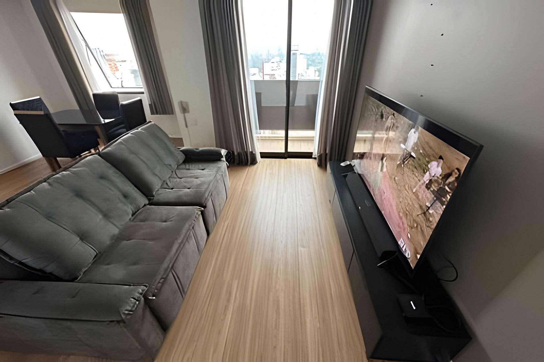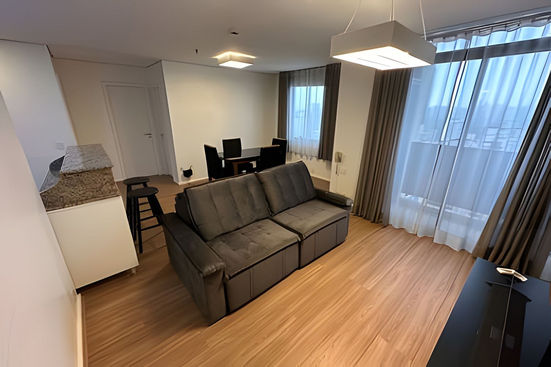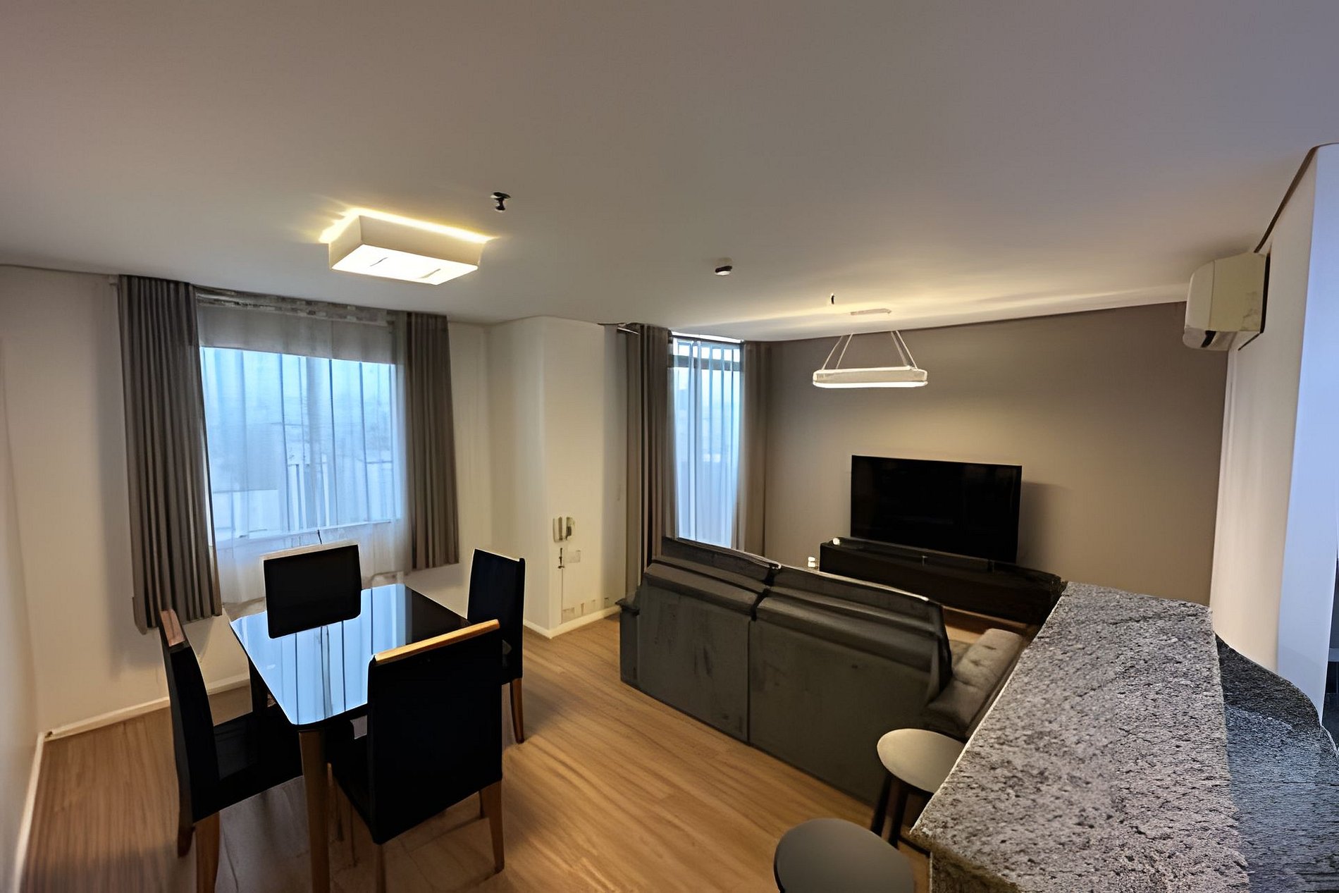 Situado em um complexo com cinema, praça de alimentação e próximo a vários restaurantes, o imóvel possui dois quartos, sendo uma suíte. Conta com um banheiro completo que atende ao segundo quarto, além da área integrada de cozinha e sala de jantar. A sala é equipada com sofá e televisão. A cozinha é compacta, dispondo de geladeira, fogão e micro-ondas.